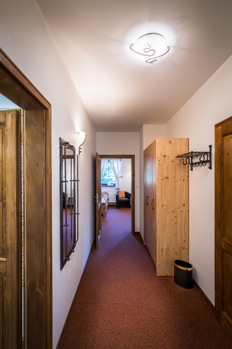 První ložnice: manželská postel s kvalitní vysokou matrací, TV s plochou obrazovkou, programy v češtině, němčině, polštině, minibar, WiFi